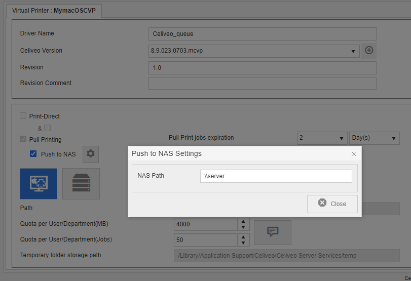 - You can choose either the Local (HDD of user macOS device) or Remote server to store the print jobs.