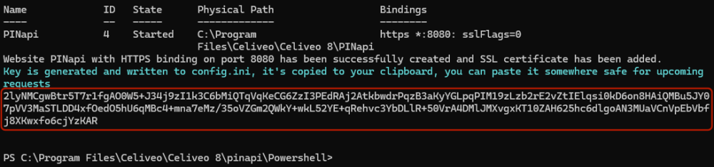 .\Setup.ps1 -Port <port>Example:.\Setup.ps1 -Port 8181 - At the end of the Setup copy the generated Authentication Bearer Token Key as marked in red as it will be necessary to access the API Endpoints.