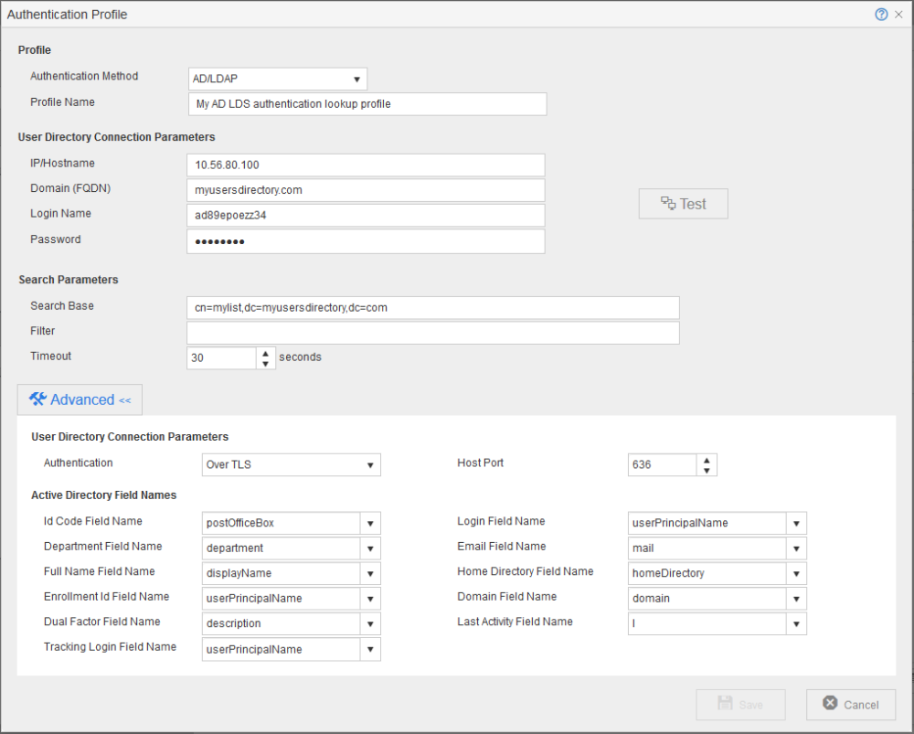 You can see all fields that by default are sAMAccountName have to be changed to userPrincipalName since sAMAccountName does not exist by default in AD DLS. - Test the connection to AD LDS using the