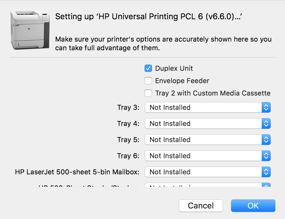 - Check Duplex Unit and any Trays if one or more printers have additional trays.