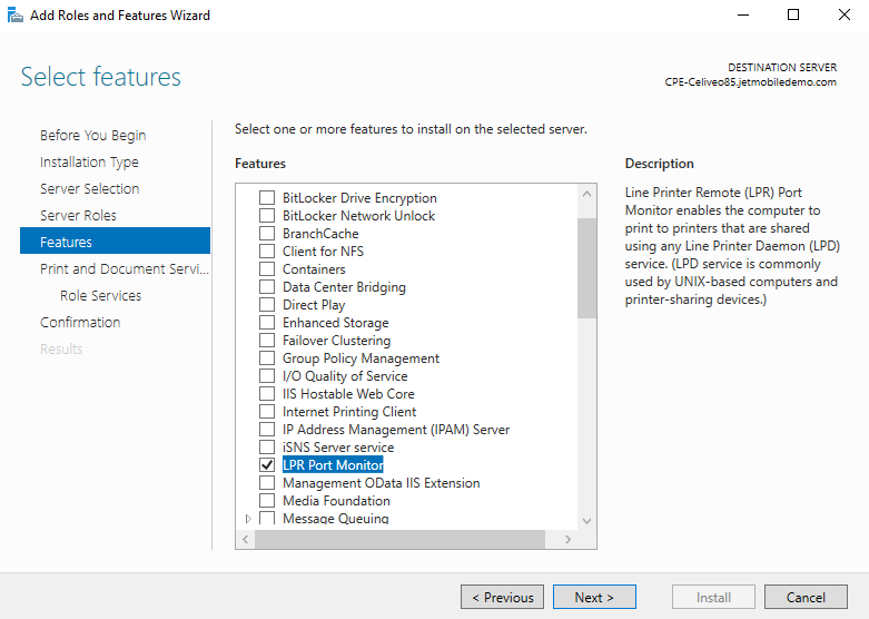 - On the Print Server, enable LPD Service and LPR Port Monitor. (Enabling these features allows printing to shared printers on this server).