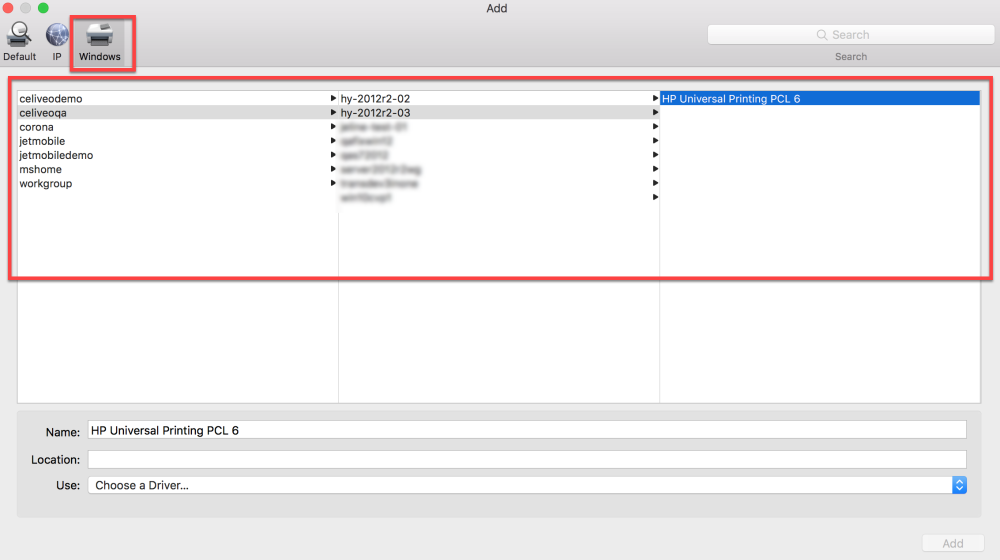 - Select the Domain name > Print Server name > Celiveo Shared Virtual Printer as shown in the screen above.