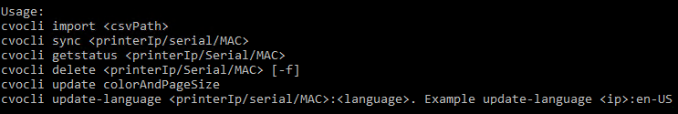| Syntax | ImportPrinter sync < filepath or IP Address > Filepath —> For multiple printers, path to the file – One IP per line. IP Address —> IPv4 address for a single printer. |