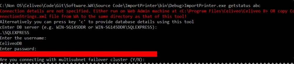 | Error | Returns Error status and description if printer is not able to be added. 0: Success -1000 : Invalid number of command line parameters 1000 : error connecting to CeliveoDB SQL database 1004 : Invalid command |