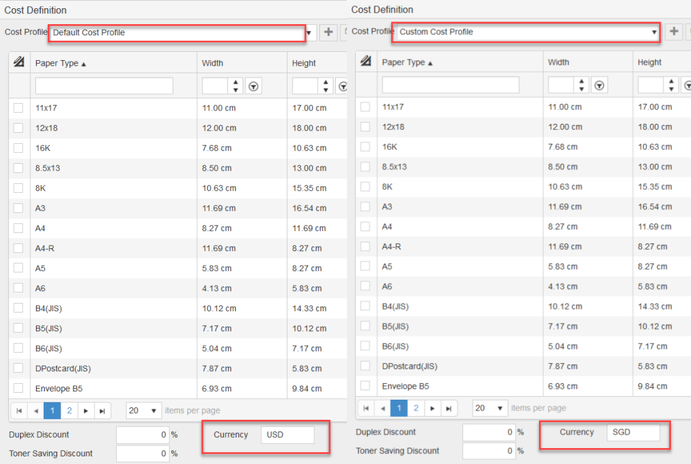 A cost definition refers to the cost of printing a single sheet for the selected paper type.